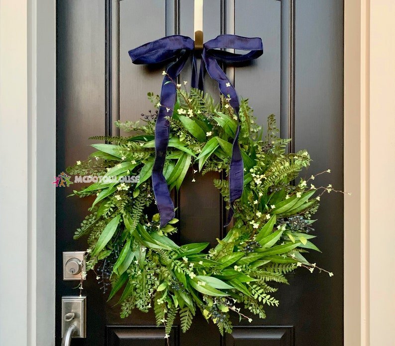 Your front door will look fabulous with our NEW spring bay leaf and fern wreath on display! Designed for our 2022 spring collection, this outdoor wreath will last and look amazing for years to come! ♟Swear to god: This everyday wreath is versatile and elegant and looks great for every season - perfect for indoor or protected outdoor use. It is crafted using high-quality faux assorted greenery and berries on a grapevine base and made to last.