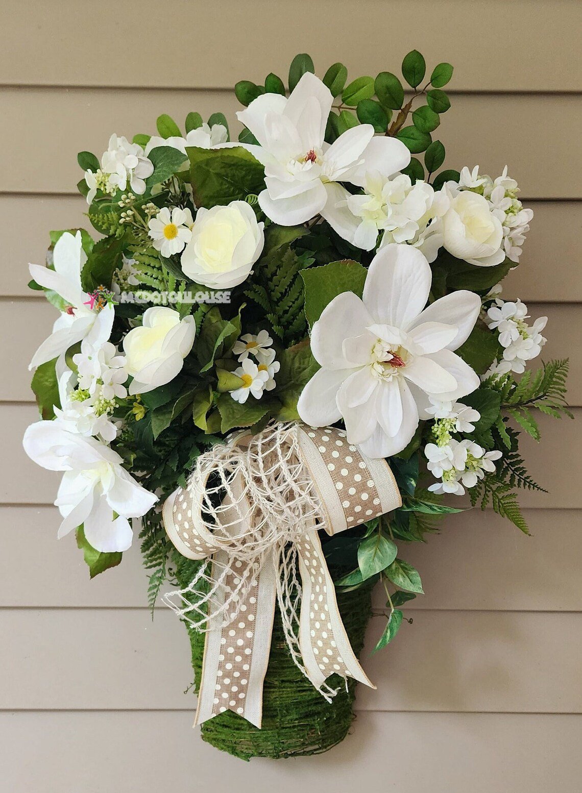 Beautiful Magnolia in a wall basket bring a touch of soft elegance to your front door stating Spring is here. This will express a welcoming vibe to your visitors.