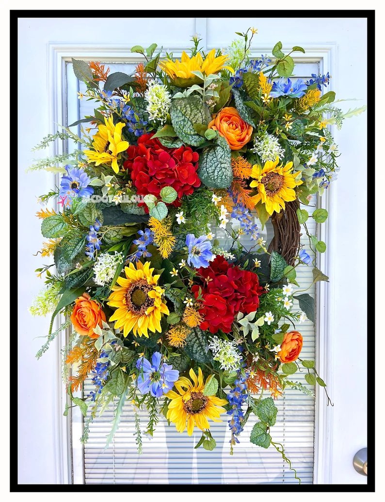 🌷🌷This is a beautifully elegant tuscan summer wreath that is sure to be an eye catcher. It features beautiful yellow sunflowers, dark orange hydrangeas, tangerine orange ranunculus, vibrant blue vinca vine and cosmos, white blossom flowers and thistle, spikes of grass with beautiful greenery. Guaranteed to add some life to your front door.
