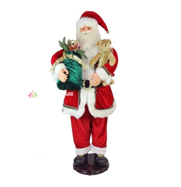 Product Features: Santa standing tall in his traditional red and white suit Holding a plush teddy bear in one hand and a plush green sack filled with gifts in the other He stands on a sturdy brown base Santa’s mouth moves as he sings “It’s the Most Wonderful Time of the Year”, “Up on the House Top”, “Jingle Bells”, “Winter Wonderland”, and “We Wish You a Merry Christmas” Motion sensor located on the front of the base Includes a black adapter Volume control knob on the back of the base Easy 2-piece assembly Recommended for indoor use – if using outdoors place under a covered area This is a display figure, it is not intended to be used as a toy