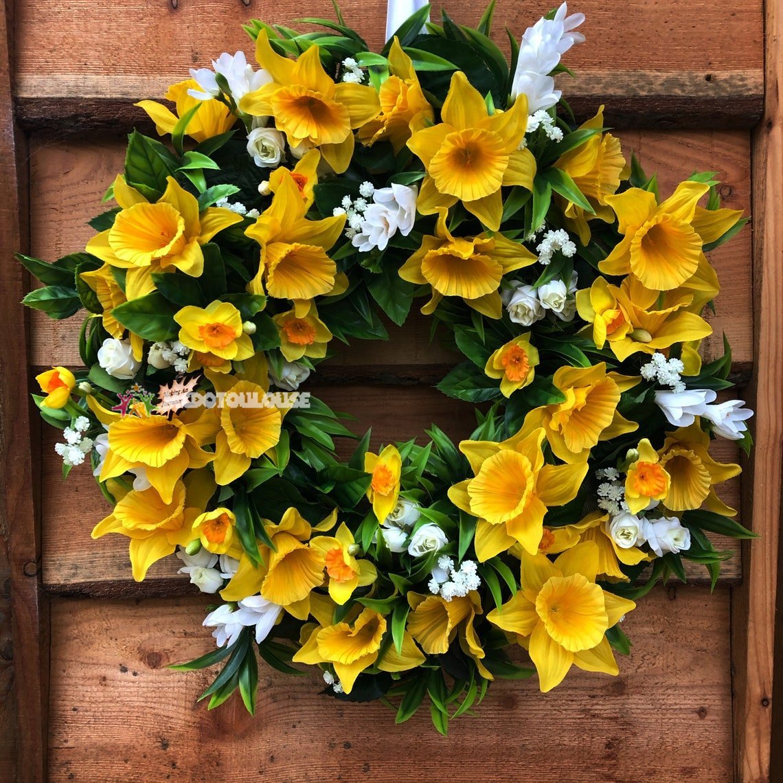✨This stunning door wreath features cheery Daffodils and white: Freesia, Roses and Gypsophila lovingly arranged with lush green foliage. ❤️Here are the most popular daffodil decorations this year! The yellow daffodils above are rare, it looks like a freshly picked flower, which is really surprising!❤️