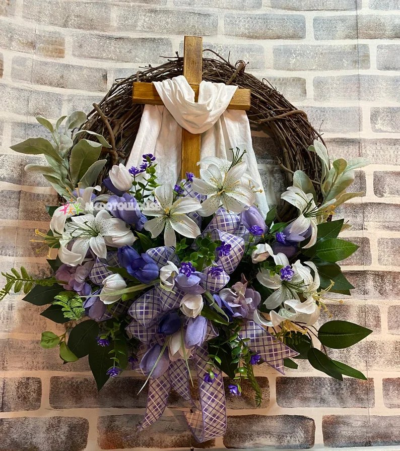 This Easter Wreath with Cross make the Perfect Housewarming Gift for a religious family,This Beautifully Handmade and Detailed wreath is a one of a kind spring wreath with purple and white flowers!