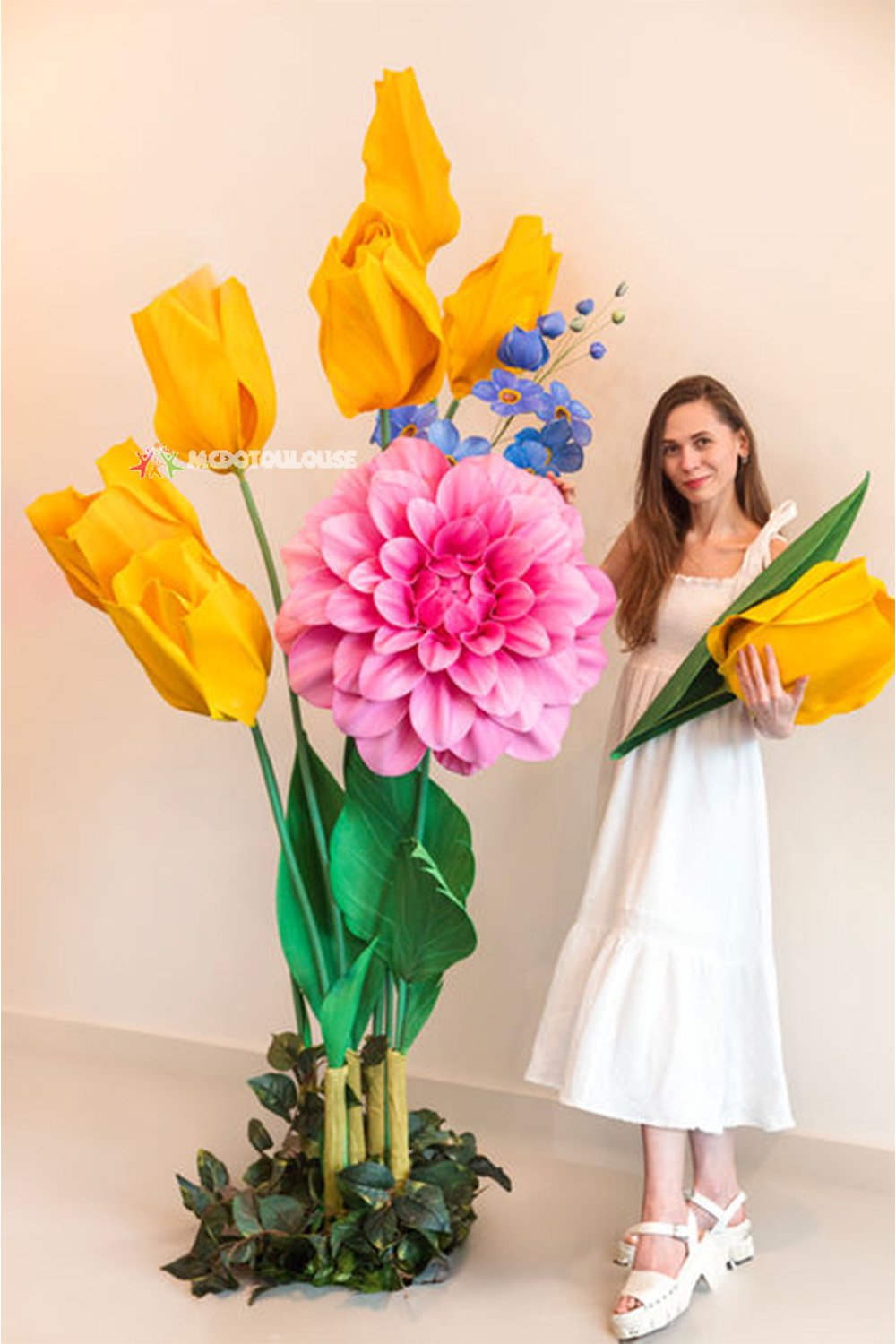Handcrafted Detail: Each petal is hand-cut, embossed and assembled by experienced craftsmen to restore the natural fluffy texture. Durable & Fade-resistant: Anti-fading paper and moisture-resistant treatment are used, and the colors remain bright after long-term display. Sturdy Metal Stem: Built-in adjustable metal rod and weighted base, firmly support 210 cm height. Versatile Styling: Suitable for wedding backgrounds, brand activities, shooting settings, exhibition hall installations and other scenes.