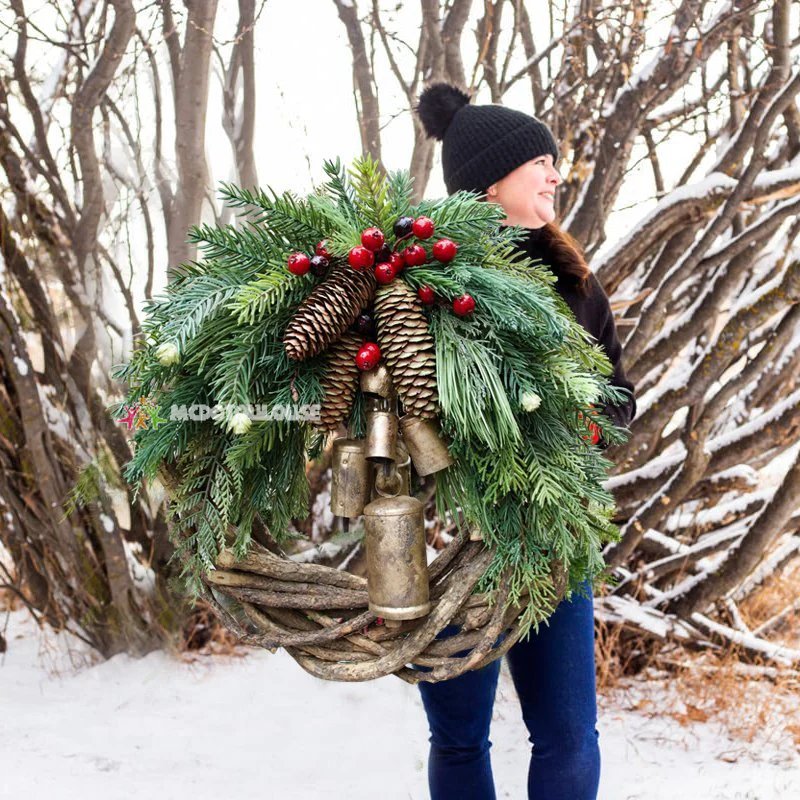 💁♀️This wreath is made on a unique rustic vine base, 😇that's plenty chunky with lots of texture. 🎄It's accented with realistic looking, faux winter greens, pinecones and berries. 🛎Chunky golden bells hang center stage and ring with movement.