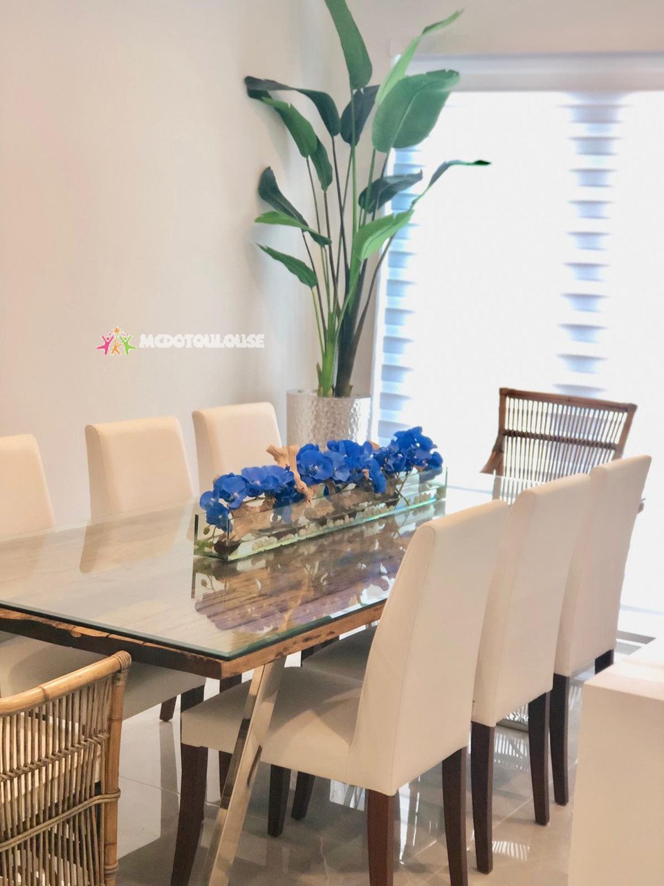 48″ Casa Moderna Glass Plate planter with blue Phalaenopsis orchids, sandblasted grape wood, white stones and our illusion water. The stunning sight of a Phalaenopsis orchids in full bloom is nothing less than breathtaking. Their huge, curving petals; double rows of gorgeous blooms march along our casa moderna glass plate planter. This translucent modern glass planter features 90 degree angles and a modern linear design. The sight of a massed display of Phalaenopsis orchids is so arresting that we have paired it with natural sandblasted grape wood to achieve a beautiful and organic contrast.