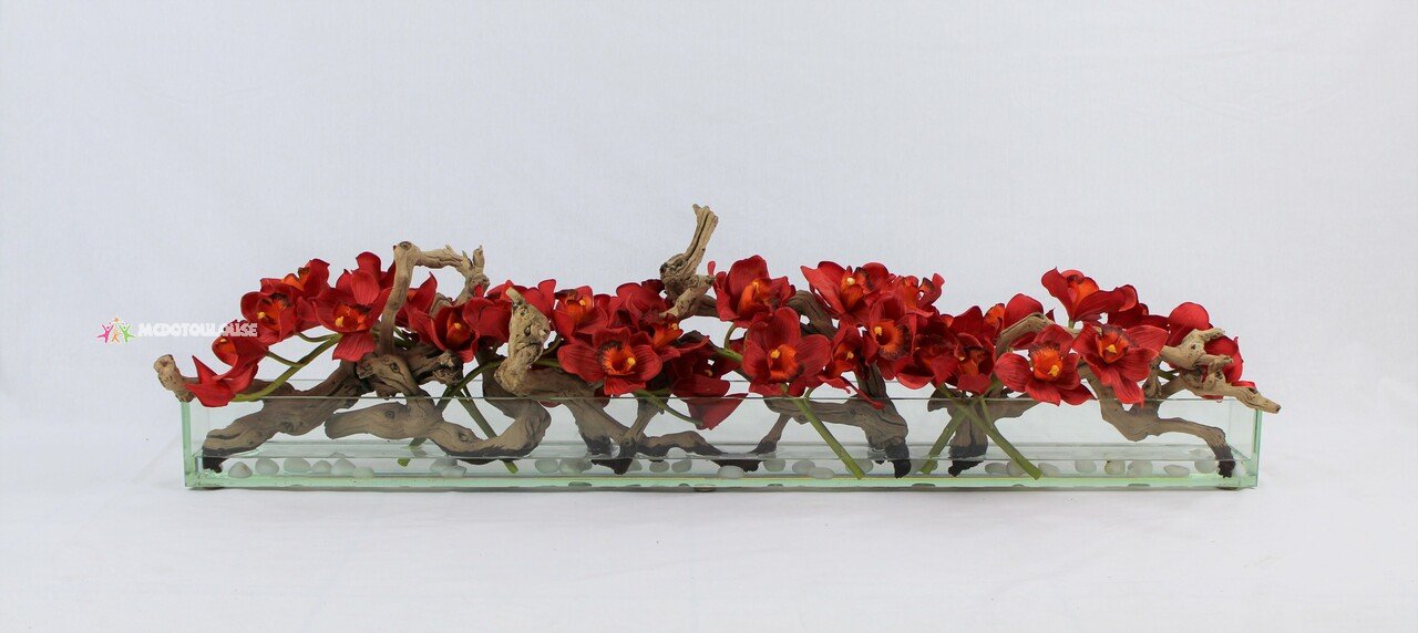 48″ Casa Moderna glass plate planter with red Cymbidiums