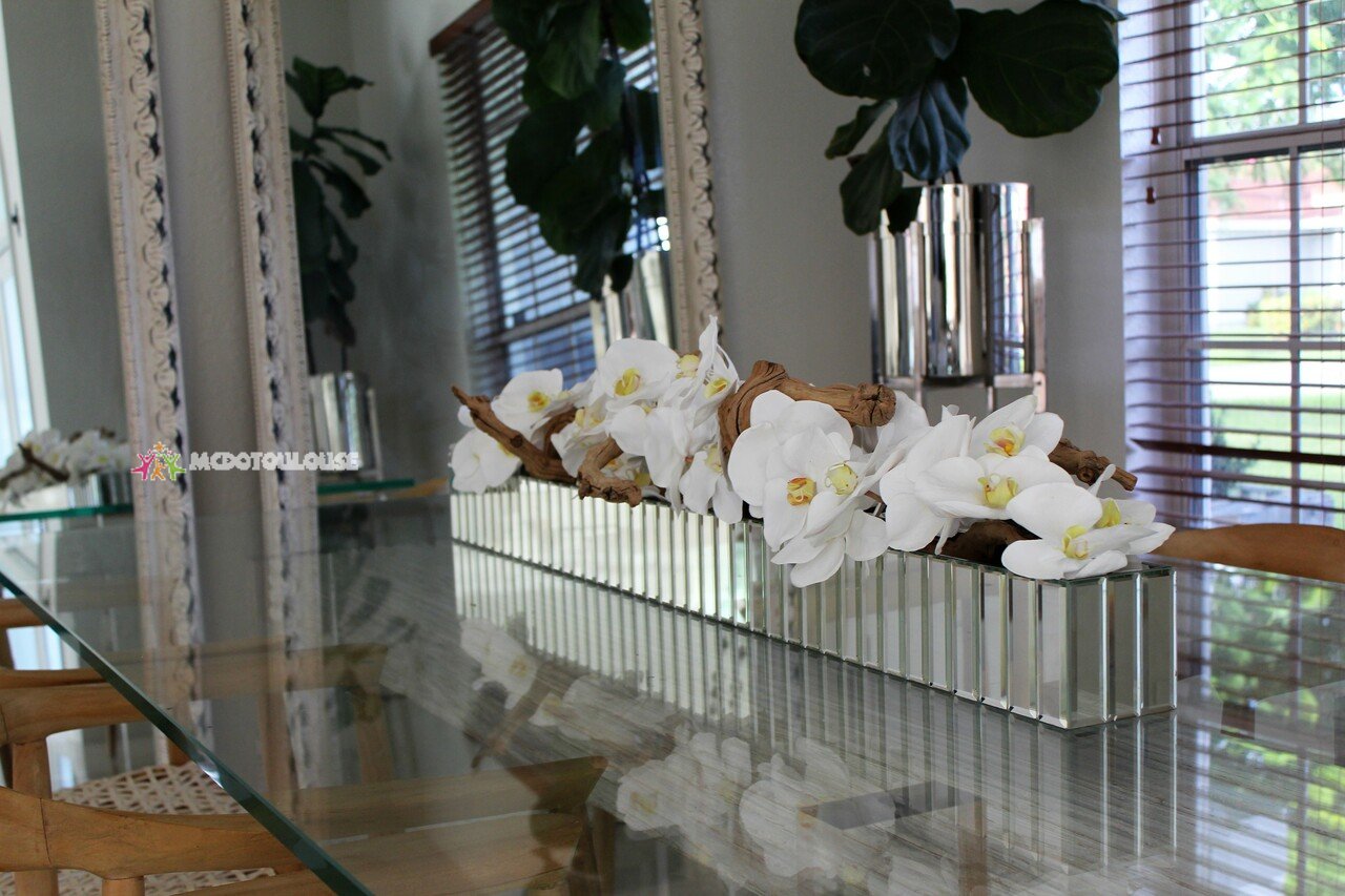48″ Mirrored planted with multiple stems of white Phalaenopsis orchids and sandblasted grape wood. The stunning sight of a Phalaenopsis orchids in full bloom is nothing less than breathtaking. Their huge, curving petals; double rows of gorgeous blooms march along our show stopping Dazzle mirrored planter. The sight of a massed display of Phalaenopsis orchids is so arresting that we have paired it with natural sandblasted grape wood to achieve a beautiful and organic contrast.