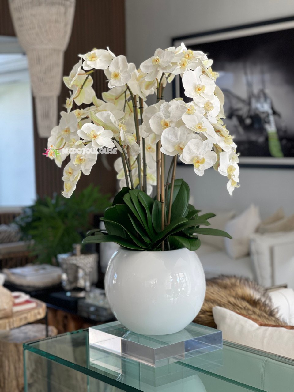 Orchids are as beautiful in bunches as they are sensational when solo. Here, our white orchid flower bouquet, potted in a stylish round fiberglass white planter, packs an unbelievable amount of gorgeous into a single container. Each faux orchid flower, leaf, and stem is handcrafted and placed by hand for beauty that blooms every day of the year. Display it in any room of your home to bring a dose of nature’s cheer indoors.