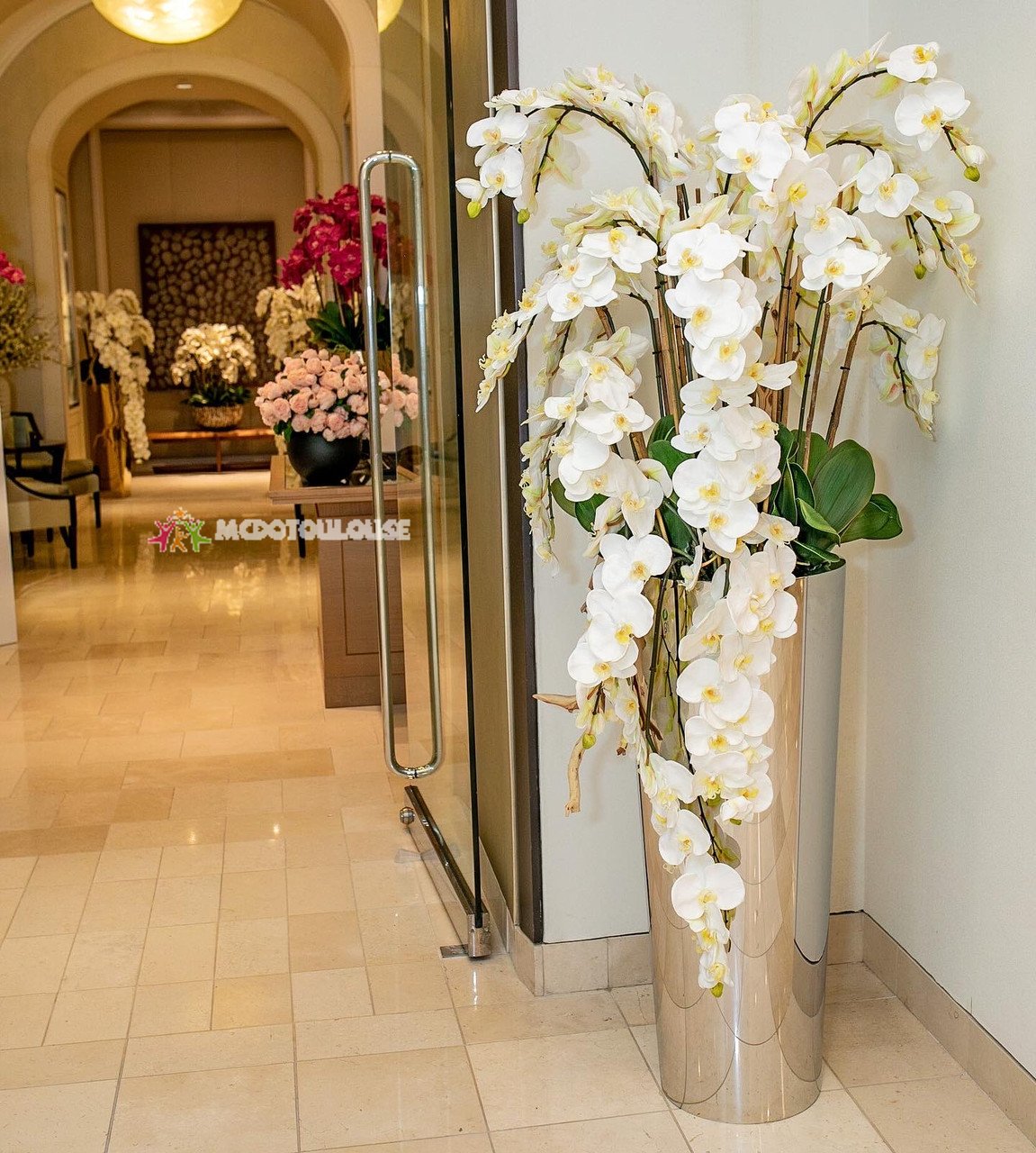 The ultimate luxury statement, this design features a high gloss stainless steel tapered cone planter in stainless steel paired with beautiful cascading white phalaenopsis orchids. Each piece is carefully crafted and polished to achieve a luxurious mirror finish. No need to water these beauties! Durable, they will last you years, and will remain beautiful year round! Designed with the upmost attention to detail and manufactured from top quality material, this piece is both luxurious and realistic.