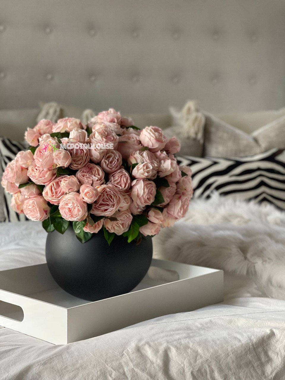 A bunch of blooming roses makes a stunning display. Blunt-cut stems are arranged in a matte black fishbowl vase for a classic touch of natural beauty. A mainstay of elegant bouquets and summer gardens, the rose is a flower with a rich history. It was first cultivated some 5,000 years ago, most likely in China, and it has come to represent many things. This arrangement captures the beauty and spirit of the world’s most universally loved flower; it features the real touch roses in different stages of bloom, known as a symbol of purity and innocence. This arrangement makes a stunning tabletop accent
