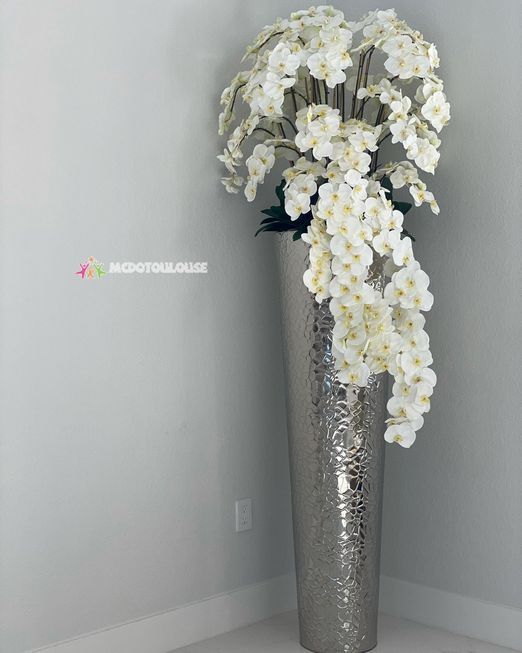 The ultimate luxury statement, this design features a extra tall hammered stainless steel tapered cone planter paired with beautiful cascading white phalaenopsis orchids. Each piece is carefully crafted to achieve a luxurious look. No need to water these beauties! Durable, they will last you years, and will remain beautiful year round! Designed with the upmost attention to detail and manufactured from top quality material, this piece is both luxurious and realistic.