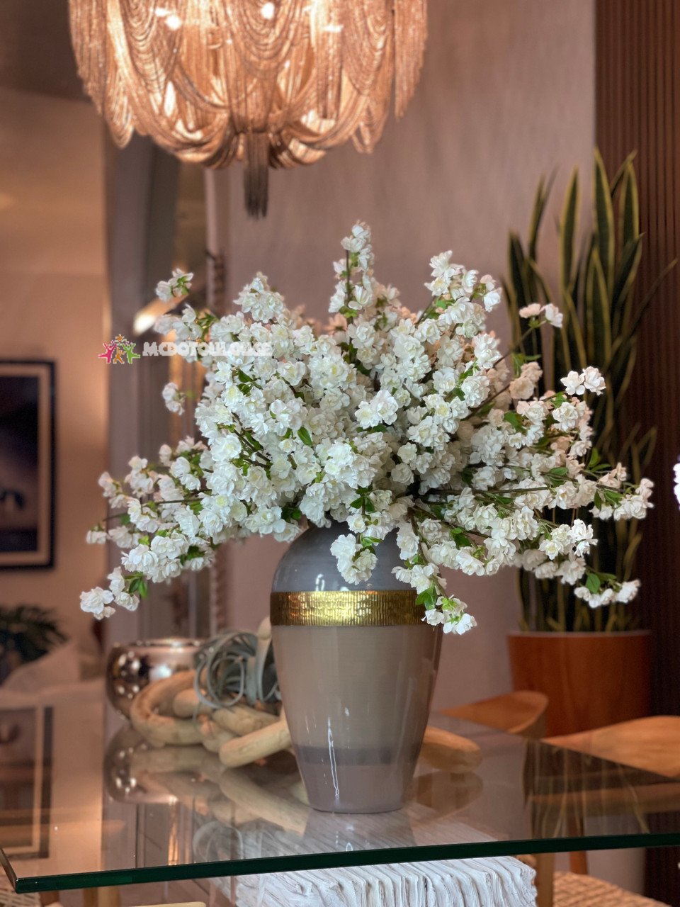 This bouquet of elegant white cherry a adds a fresh and stylish touch to any room. The branches are presented in a our goddess glass vase, anchored in illusion water and are the perfect decorative accent for a large coffee table or dining room console.