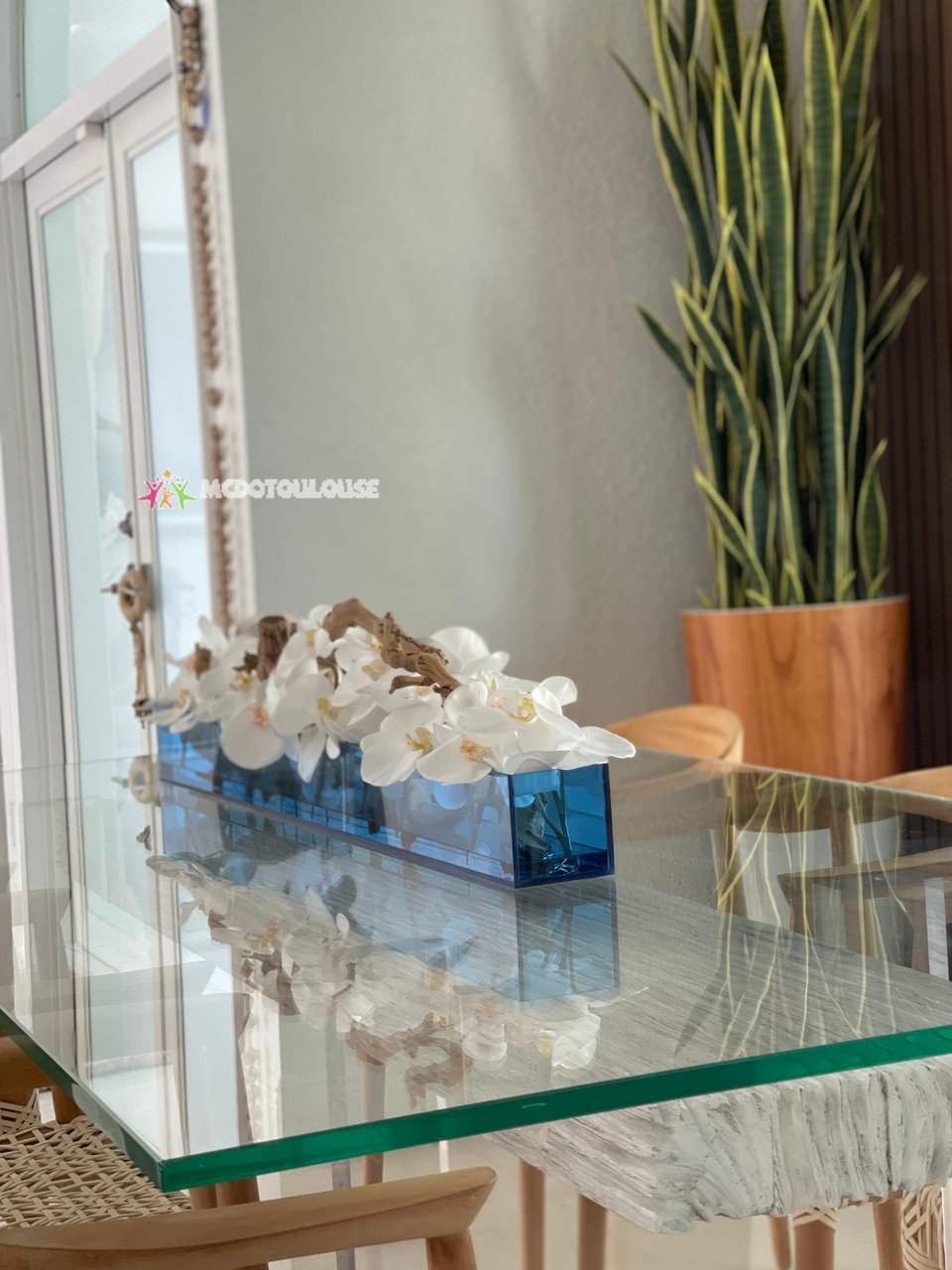 48″ Casa Moderna made of blue acrylic plates with white phalaenopsis orchids, sandblasted grape wood, and our illusion water. The stunning sight of a now white orchids in full bloom is nothing less than breathtaking. Their huge, curving petals; rows of gorgeous blooms march along our Casa Moderna blue acrylic plate planter. This blue translucent modern glass planter features 90 degree angles and a modern linear design. The sight of a massed display of white vanda orchids is so arresting that we have paired it with natural sandblasted grape wood to achieve a beautiful and organic contrast.