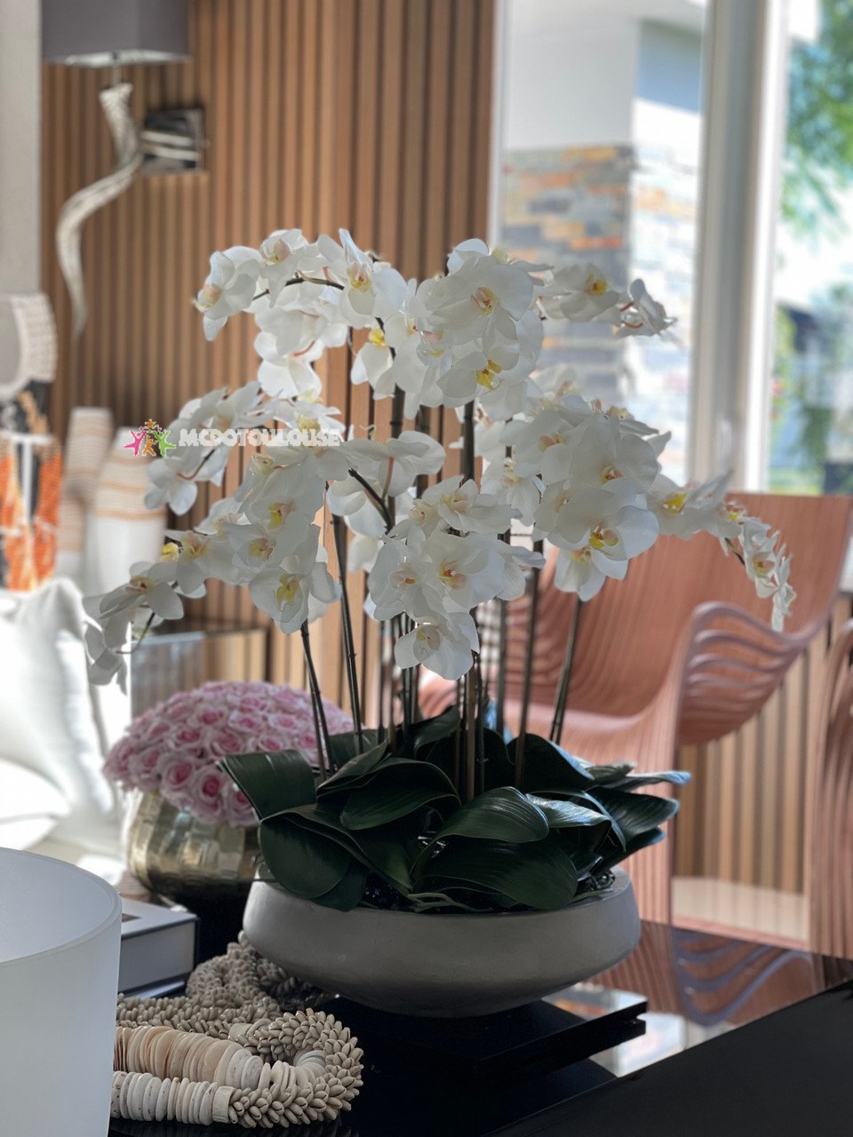 White Phalaenopsis Orchids in Newport bowl. Beautiful and natural looking faux orchids delicately arranged in an oversized concrete bowl. Paired together, this piece adds a natural and modern aesthetic appeal to your decor. Its lightweight fiberstone construction and white colored orchids make this arrangement highly versatile.