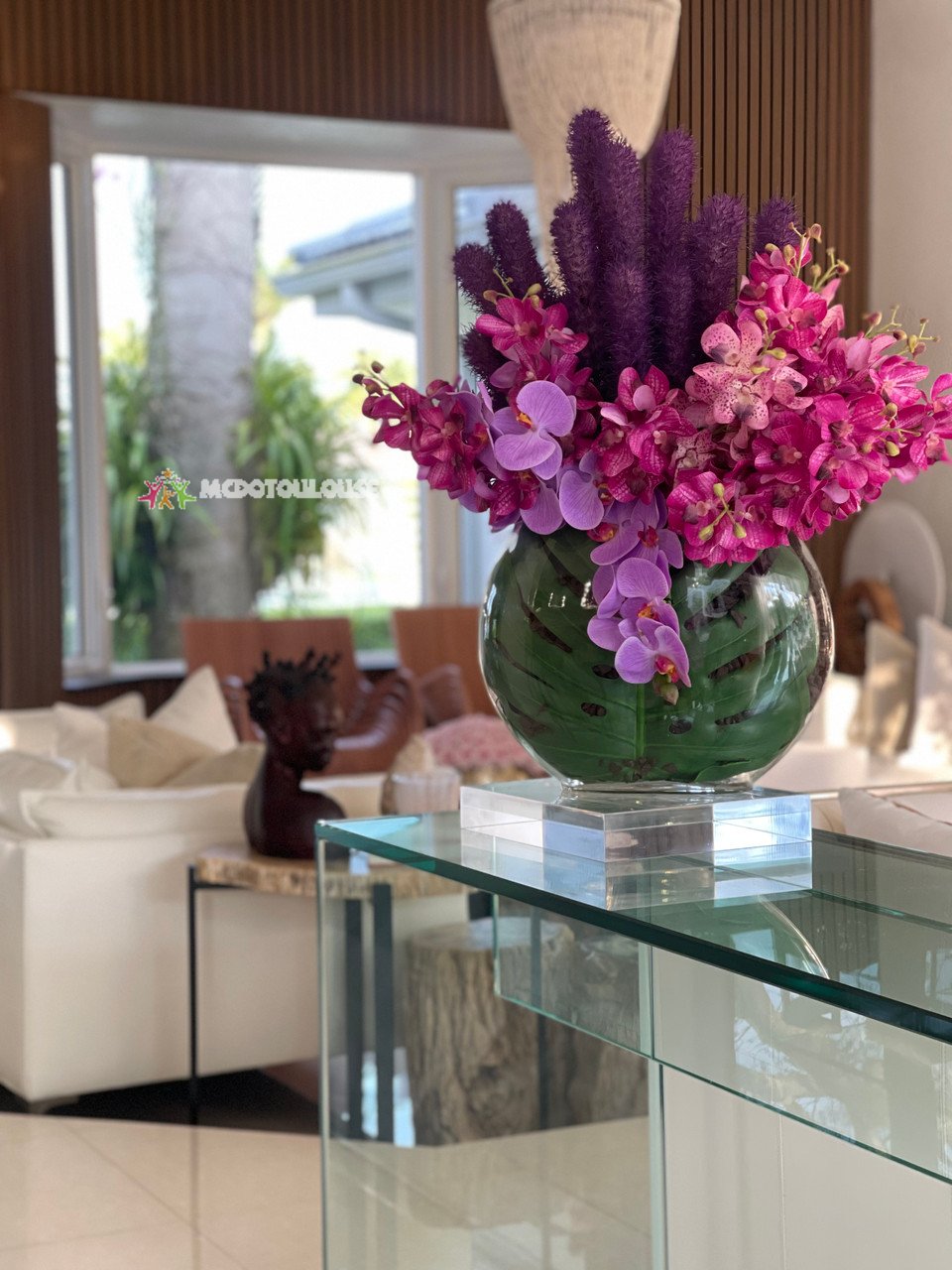 A bountiful and beautiful bouquet of “real touch” flowers take center stage on our moon vase. This show stopping selection of flowers include purple liatris mixes with fucsia mokara orchids, phaleanopsis orchids and vanda orchids wrapped on a green monstera leaves. This tropical bouquet of everlasting exotic flowers will brighten up any room. The thin profile of the moon vase makes it perfect for a console or buffet table.