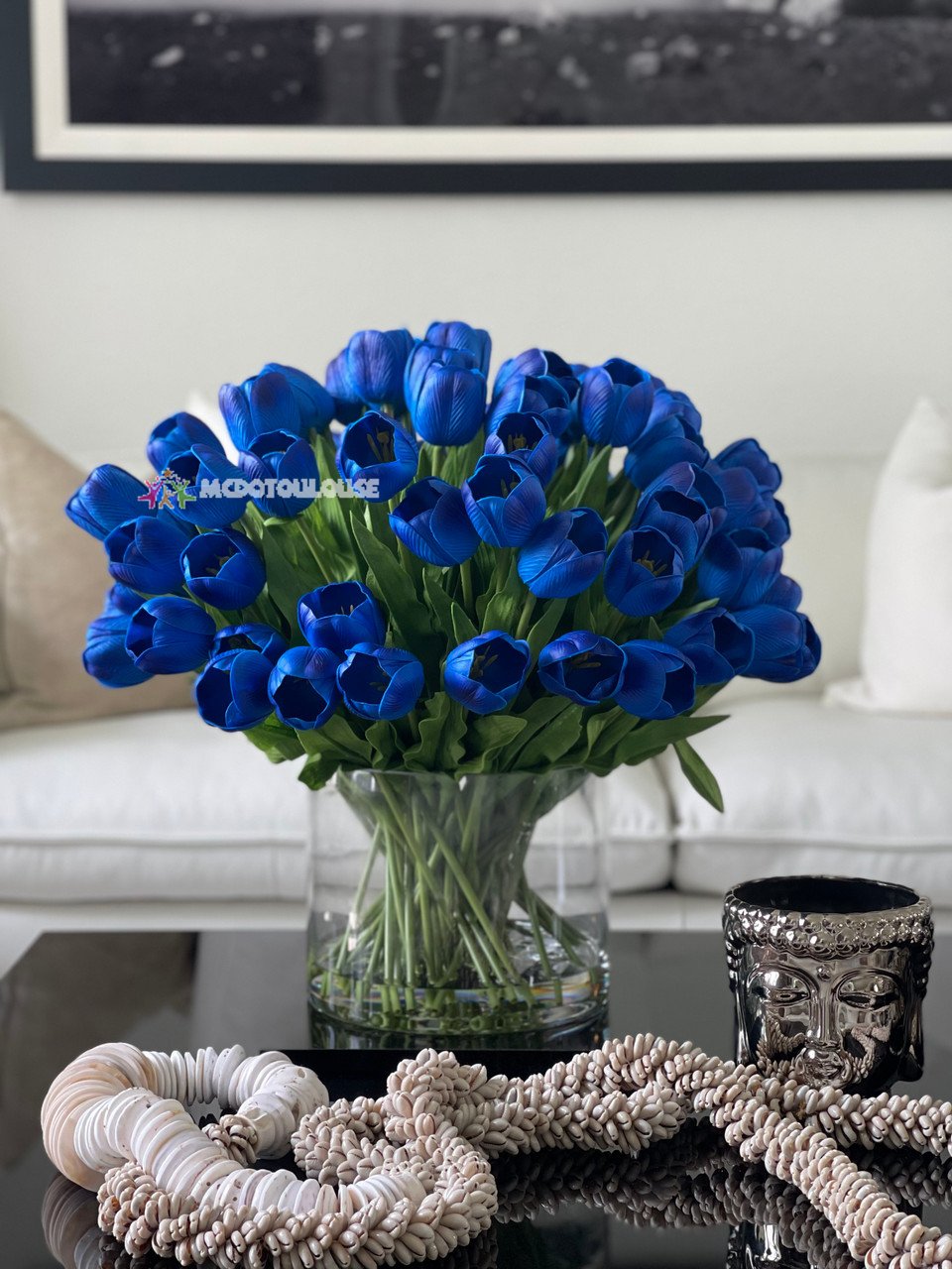 This arrangement features a bountiful bunch of blue tulips is simply breathtaking. Handcrafted and uncommonly lifelike, these blooms mixed with shapely leaves look as though they were just picked from a spring garden. This crisp and clean arrangement is set in a glass cylinder with acrylic “water,” adding to its realistic charm.