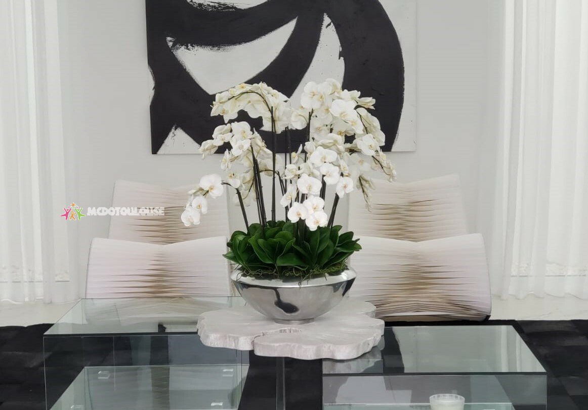 Graceful and exotic, the white orchid has symbolized integrity, nobility, and luxury for centuries. Our enduring, snow white phalaenopsis arrangement captures the artistry and spirit of natural orchids. It’s prized for its profusion of perfect blooms. Vertical bamboo stakes, broad green leaves, and a genuine moss base add to the realism of this arrangement. Often called the “moth orchid,” the phalaenopsis is a favorite among our designers for its dense leaves, elegantly arching sprays and lovely white blooms. Our remarkably lifelike arrangement is staked into a moss-covered silver avenue bowl for a timeless, authentic look that will endure for years to come. This arrangement is just the right size and is versatile enough to use as a coffee table centerpiece, a dining room or console table. It has a luscious tropical feel that will add vibrancy and elegance to any room.