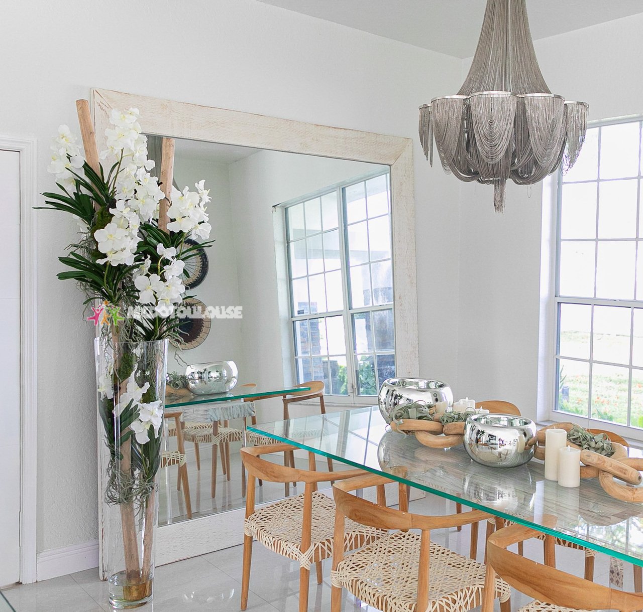 White blooms have made the Vanda orchid a favorite among lovers of exotic flowers. But growing these gorgeous orchids can be tricky; they require bright light and humidity and tend to look best when left in one spot. Our enduring artificial Vanda orchids arrangement looks stunning anywhere—in any light or climate. Generously scaled, lush, and abundant, this arrangement features broad, true-to-life leaves anchored to a piece natural California driftwood. Adding to its beauty, the whole ensemble fits within a handmade voluminous tapered cylinder. Its translucent and clear glass adds to the realism of this statement piece
