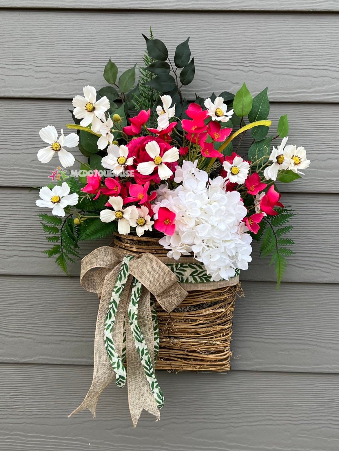 This beautiful magenta and white spring basket should last you for years as the grasses and flowers are securely glued to the styrofoam base to compliment your decor throughout the years.