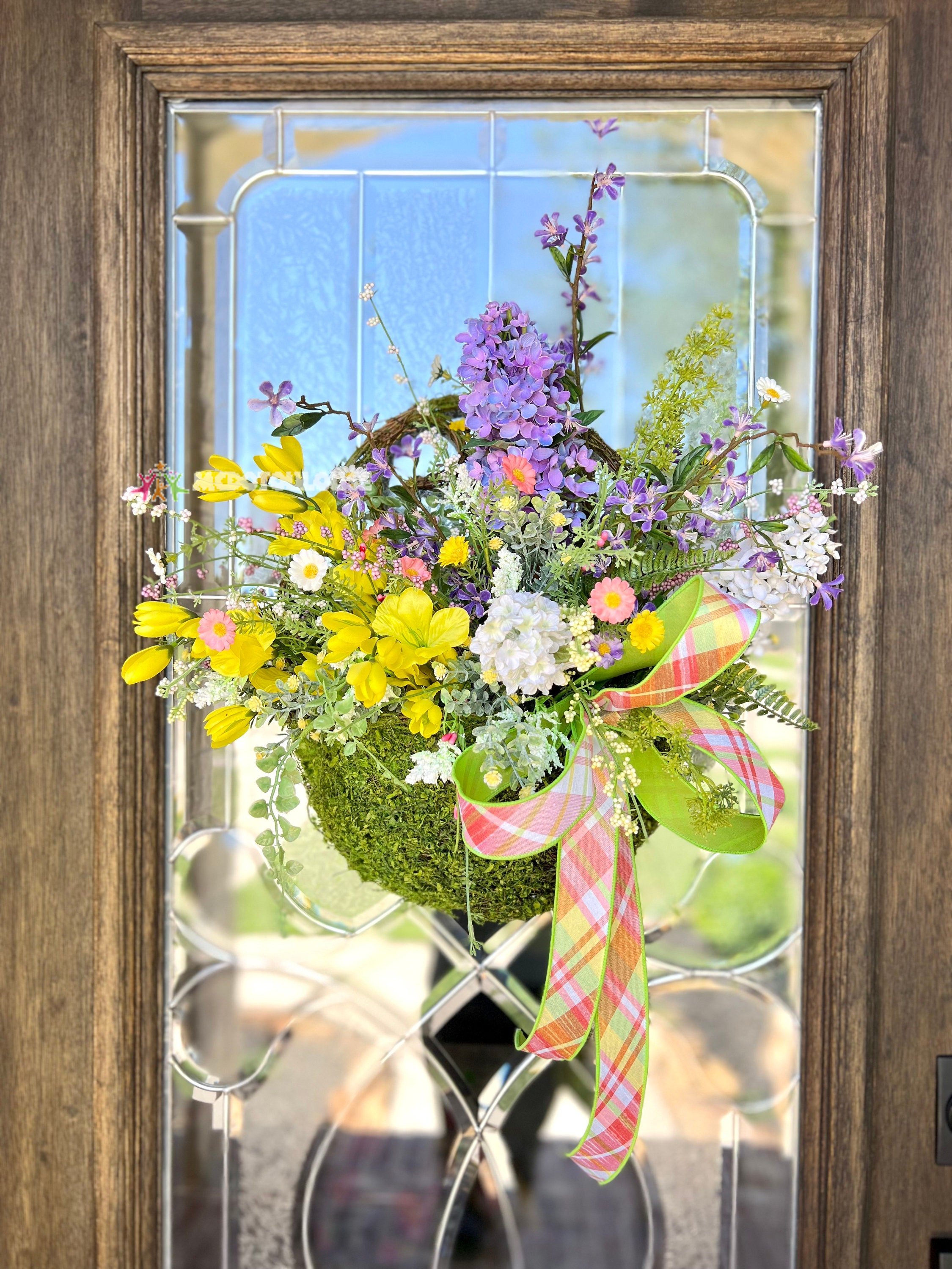 Welcome Spring to your home and to all who enter with a basket full of spring florals. All The must haves for spring florals are placed in perfect groupings to look fresh clipped and natural. This moss basket floral arrangement can be hung on your front door or indoors to add to your spring home decor. Perfect for Easter and Spring home decor.