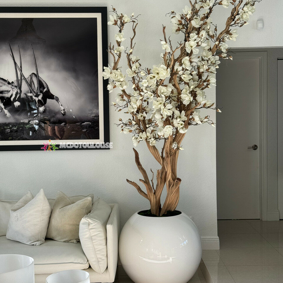 Enjoy beautiful, lifelike magnolia tree that won’t lose its flowers after spring awakens. Each tree is a one of a kind. Paired with our 30″ glossy white planter, this natural California tree’s flowers are placed by hand by our skilled artisans onto large wood trunks of California mountain wood. Displayed here in a real tree, magnolia flowers are cheerful and elegant in any season. Showcase this lovely faux tree in a foyer or corner of any room.