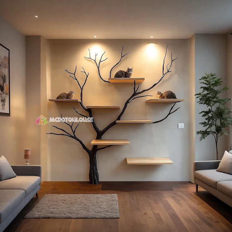 The tree-shaped wooden shelf in the picture is a creative interior product, handcrafted from solid wood by skilled craftsmen with many years of experience. The design is inspired by nature with wooden branches forming unique decorative shelves, both optimizing living space and enhancing the beauty of the house.