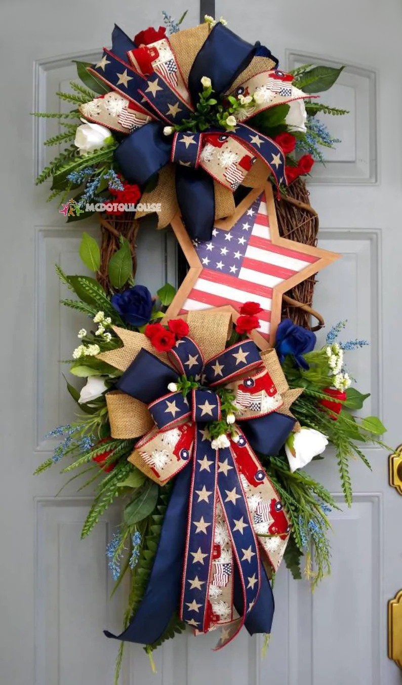 📐Size: This wreath is made on a 18" oval grapevine wreath base.Filled with mixed flowers, Star sign, beautiful bow and more.