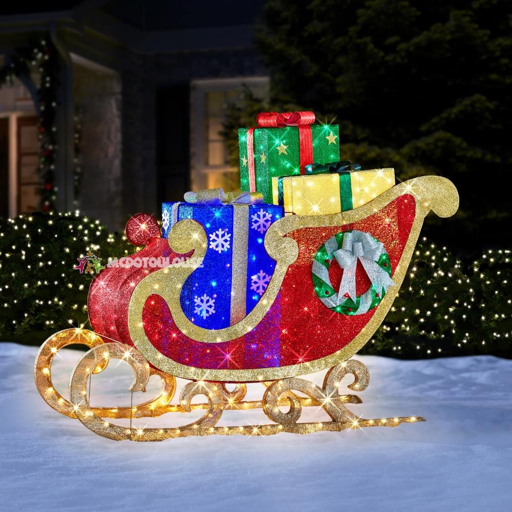 This beautiful lamp post shines and sparkles with 120 Warm LED lights, wrapped with glittery gold weather resistant fabric and bronze metal trims.