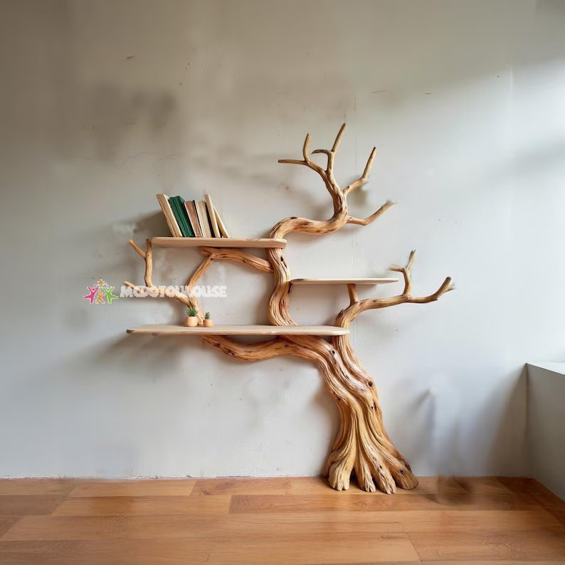 This wood bookshelf for wall is designed by us to be very easy to install and has good load bearing capacity. We create beautiful, handmade shelves from natural tree branches, highlighting their unique shapes and textures. Our skilled artisans put their heart into every piece, making each shelf a unique work of art. Committed to sustainability and quality, we offer decor that is both useful and celebrates nature's beauty.