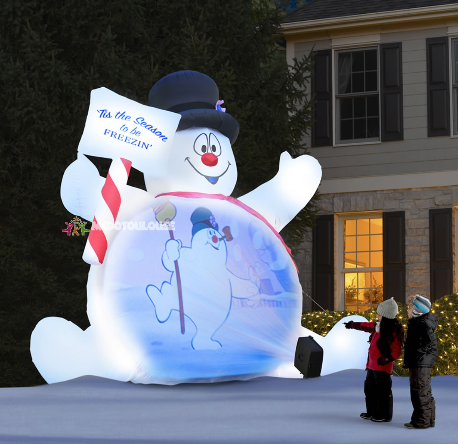 This is the 10' inflatable Frosty The Snowman that entertains passersby with a projector that plays clips from the classic 1969 cartoon on his belly.